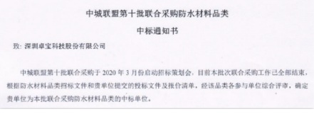 2016年,在中城聯(lián)盟綠色地產(chǎn)聯(lián)合采購第六批簽約大會上,卓寶科技成為中城聯(lián)盟的防水材料戰(zhàn)略合作供應商,開啟了合作共贏的發(fā)展道路。