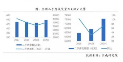 貝殼研究院數(shù)據(jù)顯示,2019年二手房交易額增長2.8%,達(dá)到6.5萬億,2017年~2019年連續(xù)三年二手房銷售套數(shù)超過400萬套,銷售額超過6萬億。2019年,新房銷售額再創(chuàng)新高,增長9%至13.8萬億。