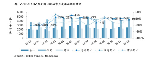 2019年 12 月,全國(guó) 300 城市成交樓面均價(jià)為 2497 元/平方米,環(huán)比下滑 3%,同比增加 19%;其中住宅類用地(含住宅用地及包含住宅用地的綜合性用地)成交樓面均價(jià)為 4202 元/平方米,環(huán)比上漲4%,同比上漲 12%,商辦類用地成交樓面均價(jià)為 2539 元/平方米,環(huán)比上漲 14%,同比上漲 29%。