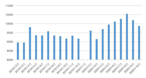 圖:2019年以來(lái)全國(guó)房?jī)r(jià)月度變化(單位:元)