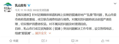 20日,乳山市人民政府新聞辦公室官方微博發(fā)布情況通報(bào),針對近期媒體報(bào)道和網(wǎng)上反映的銀灘房地產(chǎn)“亂象”等問題,乳山市委市政府高度重視,成立聯(lián)合調(diào)查組進(jìn)行調(diào)查。對屬實(shí)的問題將依法依規(guī)嚴(yán)肅處理,切實(shí)維護(hù)消費(fèi)者權(quán)益。對不屬實(shí)的問題及時(shí)澄清回應(yīng)。