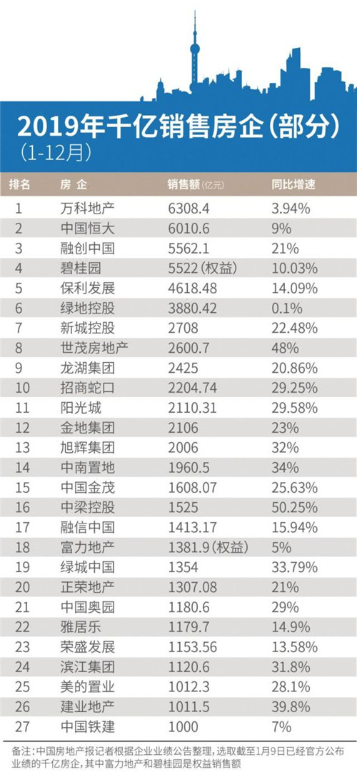 根據(jù)中國(guó)房地產(chǎn)報(bào)記者統(tǒng)計(jì),2018年新晉千億的房企共有13家,而2019年這一數(shù)字僅為5家,分別為奧園地產(chǎn)、濱江集團(tuán)、美的置業(yè)、建業(yè)地產(chǎn)和中國(guó)鐵建。