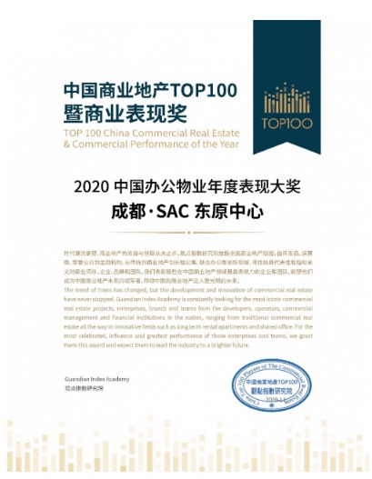 會上,觀點指數(shù)研究院獨家發(fā)布2020年度中國商業(yè)地產(chǎn)TOP100和商業(yè)表現(xiàn)獎,其中東原商業(yè)旗下成都·SAC東原中心項目憑借以人為本的運營理念和有溫度的物業(yè)服務,榮獲2020中國辦公物業(yè)年度表現(xiàn)獎,為寫字樓物業(yè)服務行業(yè)樹立了精品標桿。