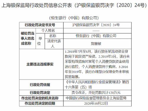 銀保監(jiān)會網(wǎng)站消息,恒生銀行(中國)有限公司因2018年7月至8月,放任某流動資金貸款用于固定資產(chǎn)投資。2019年3月,未采取有效措施對某筆個人消費貸款資金使用進行監(jiān)控,個人消費貸款用于購房。2016年至2019年,辦理部分保理業(yè)務(wù)未審核貿(mào)易背景。三項違法違紀事實被上海銀保監(jiān)局處罰款120萬元并責(zé)令改正。