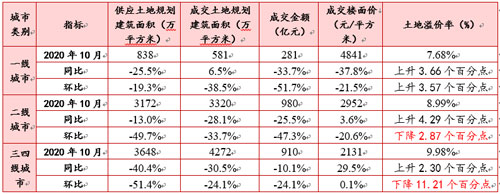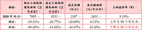 溢價率:土地溢價率環(huán)比下降4.06個百分點。2020年10月,全國主要100個大中城市土地平均溢價率為9.19%,環(huán)比下降4.06個百分點,同比上升3.43個百分點。