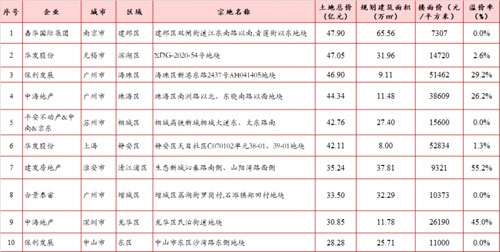 成交地塊TOP10:一線城市地塊競爭激烈,多地塊高溢價成交