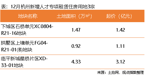 除了上海,12月杭州新增3宗人才專項(xiàng)租賃住房用地,分別位于下城區(qū)、拱墅區(qū)及林平新城,總面積6.72萬平方米,總起價(jià)5.65億元。