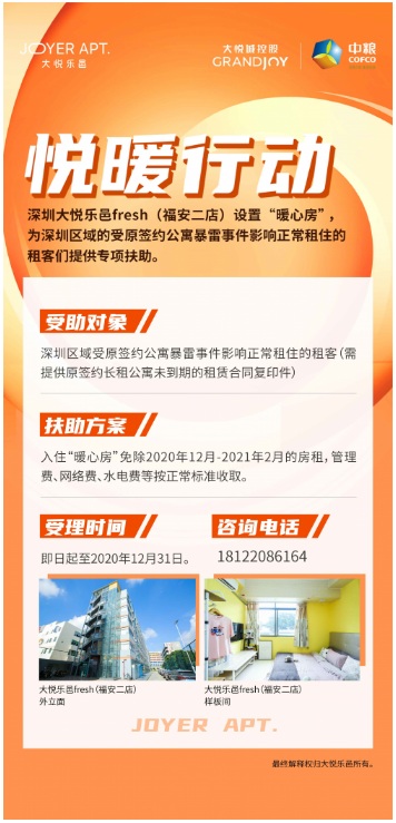 住房影響投資和消費(fèi),事關(guān)民生穩(wěn)定和社會發(fā)展,今年兩會期間政府工作報(bào)告重申“堅(jiān)持房子是用來住的,不是用來炒的”定位。面對一系列“暴雷”事件的持續(xù)發(fā)酵,大悅樂邑作為中糧集團(tuán)旗下大悅城控股品牌生態(tài)圈中的重要業(yè)態(tài)之一,推出“悅暖行動”計(jì)劃,通過在深圳區(qū)域的公寓門店設(shè)置“暖心房”,對受原簽約公寓暴雷事件影響正常租住的租客們提供專項(xiàng)扶助,為租客護(hù)航過冬,以綿薄之力傳遞社會溫暖,踐行大悅城控股的社會責(zé)任和品牌使命!
