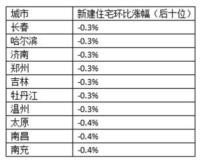 房價下降的城市中,排名70城最后十位的城市有南充、南昌、太原、溫州、牡丹江、吉林、鄭州、濟(jì)南、哈爾濱、長春。其中南充、南昌、太原新房價格環(huán)比均下跌0.4%;其余7個城市新房價格環(huán)比下跌0.3%。
