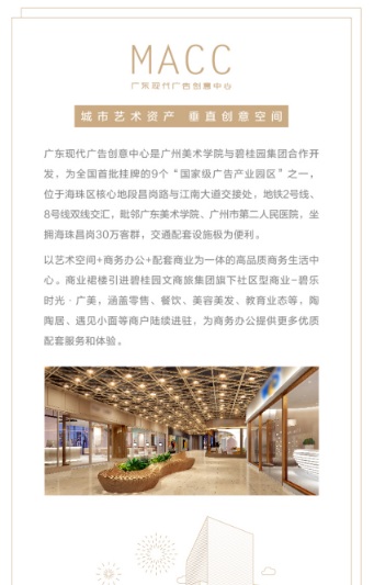 廣東現(xiàn)代廣告創(chuàng)意中心由碧桂園文商旅集團(tuán)全力管理運營,作為碧桂園集團(tuán)旗下專注商業(yè)文旅資產(chǎn)的運營平臺,商業(yè)總量逾 1015 萬㎡,商業(yè)項目超 100 個,戰(zhàn)略合作品牌商家1000+家,囊括購物中心、社區(qū)商業(yè)、商業(yè)綜合體、長租公寓、品質(zhì)辦公等等。