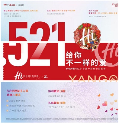 5月下旬,跨界聯(lián)名海底撈,打造了"521給你不一樣的愛"的主題活動(dòng),60000張海底撈專屬卡為全國(guó)項(xiàng)目提供更大的銷售支持,整體活動(dòng)實(shí)現(xiàn)超20億的業(yè)績(jī)。