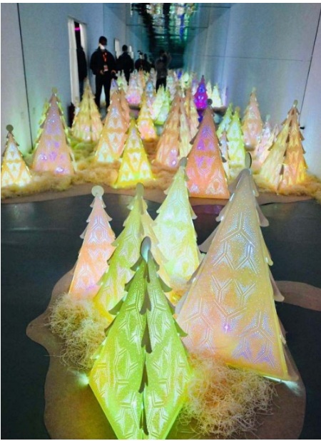 藝術(shù)家以“人、從、眾、木、林、森”六個字為概念,邀請觀眾觸碰《眾森》紙藝互動裝置,光影在叢林間展開,從單一“人”的個人開始,觸發(fā)傳播,“從”而達(dá)“眾”。