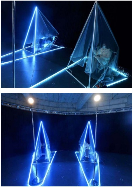 持證催眠師、藝術(shù)家王欣在身心庇護(hù)所等待需要釋放壓力的打工人,用海洋藍(lán)色調(diào)的燈光與催眠的元素將觀眾引入心靈的另一個維度,給予他們心靈的慰藉。