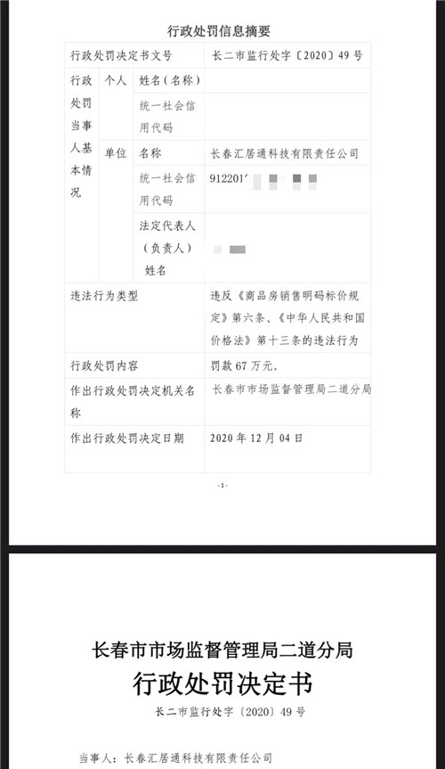 決定書顯示,該案中,長(zhǎng)春市鵬和房屋開發(fā)有限責(zé)任公司向匯居通提供了每平方米9050元左右的底價(jià),匯居通在銷售商品房時(shí),將約定價(jià)(最終售價(jià))與底價(jià)之差作為“溢價(jià)金”向購房人收取,作為銷售傭金。但在介紹房源時(shí),銷售方未明碼標(biāo)價(jià),違反了相關(guān)法律法規(guī),擾亂市場(chǎng)秩序。責(zé)令其改正違法行為,并處以67萬元罰款。上圖為長(zhǎng)春市市場(chǎng)監(jiān)管部門出具的行政處罰決定書
