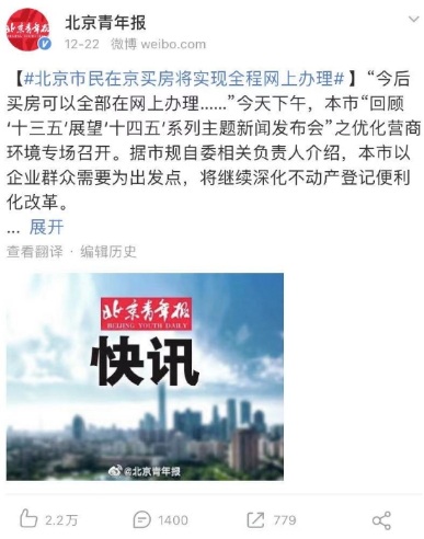 上周,北京市買房將實(shí)現(xiàn)全程網(wǎng)上辦理的新聞登上微博熱搜,話題總閱讀量接近1億。