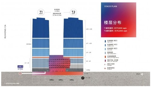 瑞虹企業(yè)天地以雙子樓造型相互輝映,樓宇高約170米,共33層(實(shí)際層),大堂的挑空設(shè)計(jì)盡顯垂直動(dòng)線上的靈動(dòng)感。在空間設(shè)計(jì)方面,為了滿足企業(yè)對(duì)于空間靈活設(shè)計(jì)的需求,打造更具藝術(shù)感、更自由的工作環(huán)境,樓內(nèi)包含4.35米的標(biāo)準(zhǔn)層高和5.25米的挑高樓層,為企業(yè)提供多樣性的選擇。