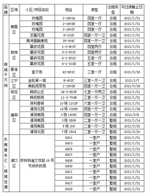 據(jù)南京住房保障和房產(chǎn)局發(fā)布的信息,南京市住房租賃行業(yè)協(xié)會秘書長單位東南公寓公司、副會長單位銀城佳遇、銀城千萬間已梳理出第一批免費過渡房源,這些房源主要分布于鼓樓、建鄴、棲霞、浦口等區(qū),共計30套房源。