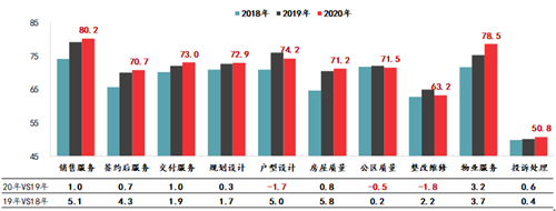 針對客戶滿意度十大關(guān)鍵端口,《白皮書》顯示,2020年銷售服務(wù)和物業(yè)服務(wù)的得分排在前兩位;戶型設(shè)計、公區(qū)質(zhì)量、整改維修滿意度均出現(xiàn)下滑情況,投訴處理慢速上升,其他端口增速放緩,均低于2019年提升幅度。其中尤以戶型設(shè)計下降最為明顯,究其原因主要是受疫情影響導致業(yè)主對產(chǎn)品空間及功能要求迅速提升。