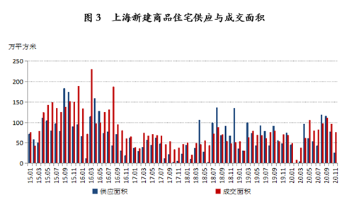 11月,上海新建商品住宅成交面積約75.9萬平方米,環(huán)比下降20.8%,同比增長8%,成交量較10月有所下降;新增供給面積25.8萬平方米,環(huán)比下降66.4%,同比下降46.7%。