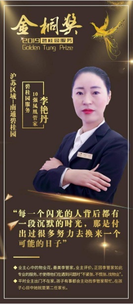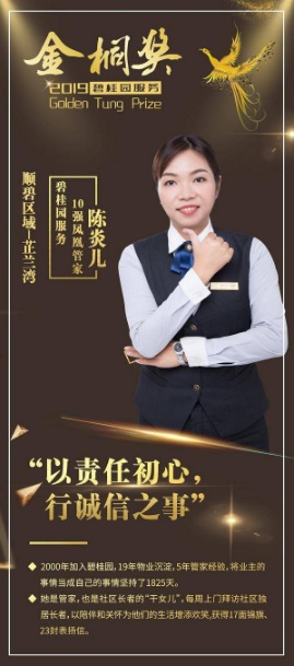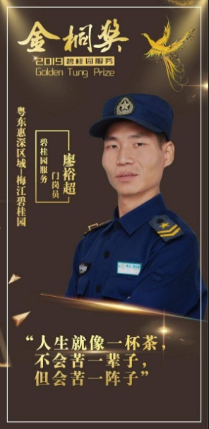 “入行19年,從事管家工作5年,在碧桂園社區(qū)里,我每天都能感受自己的成長,唯一不變的是將業(yè)主掛心中的初心,五年來每周上門和叔叔阿姨聊天,為他們的生活增添歡笑,在我看來,他們就是我的家人!
