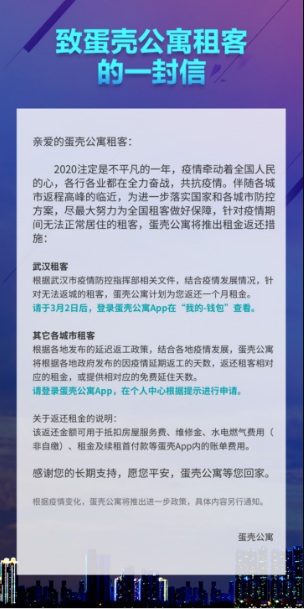 2月3日,蛋殼公寓在其官方APP發(fā)布正式公告,公布疫情期間對(duì)全體租客的補(bǔ)貼政策。