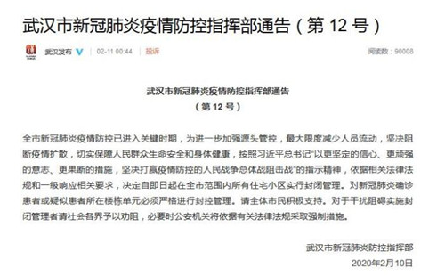 房訊網(wǎng)訊 2月10日,武漢市新冠肺炎疫情防控指揮部發(fā)布第12號通告。通告指出,決定自即日起在全市范圍內(nèi)所有住宅小區(qū)實行封閉管理。