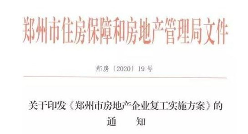 房訊網訊 2月11日,鄭州市住房保障和房地產管理局發(fā)布《關于印發(fā)〈鄭州市房地產企業(yè)復工實施方案〉的通知》(以下簡稱《通知》),《通知》要求,鄭州市2326家房地產開發(fā)企業(yè)的行政辦公部門(不含售樓處),可在審核通過后于2月24日后復工,而房地產開發(fā)企業(yè)售樓部暫緩恢復開放,恢復開放時間另行通知。