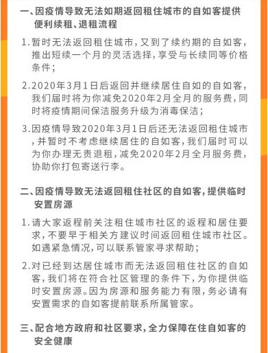 在公告中自如表示,將為因疫情導(dǎo)致,無(wú)法如期返回租住城市的自如租客提供便利的續(xù)租、退租流程,包括:1、暫無(wú)法返回租住城市,又到了續(xù)約期的租客,可靈活選擇一個(gè)月的短續(xù),享受與長(zhǎng)續(xù)同等價(jià)格條件;2、3月1日后返回并繼續(xù)居住自如的租客,屆時(shí)減免其2月全月的服務(wù)費(fèi),同時(shí)將疫情期間暫停的保潔服務(wù)升級(jí)為消毒保潔;3、3月1日后仍因疫情影響無(wú)法返回租住城市,且暫不考慮繼續(xù)居住自如的租客,屆時(shí)可為其辦理無(wú)責(zé)退租,減免2月全月的服務(wù)費(fèi),并協(xié)助租客打包和寄送行李。