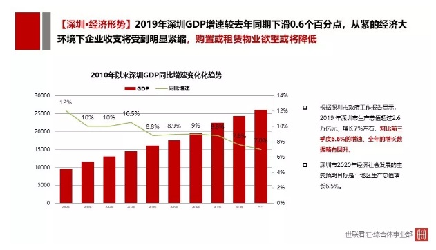 2019年深圳GDP增速較去年同期下滑0.6%,從緊的經(jīng)濟(jì)大環(huán)境下,加上2020年年初疫情影響,企業(yè)可用現(xiàn)金流預(yù)期不充足的背景下,在寫字購置或租賃方面的支出預(yù)算將收緊,原來擴(kuò)租,提升寫字樓品質(zhì)等需求將階段性驟減。