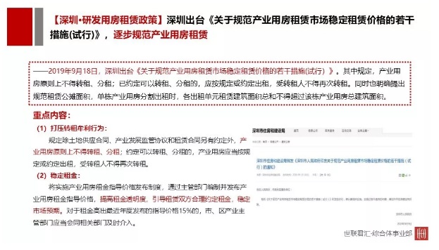 此外,前幾年伴隨著投資熱門的工改寫字樓產(chǎn)品陸續(xù)入市出臺(tái)的,是越來越規(guī)范的產(chǎn)業(yè)用房租賃政策。在2019年9月18日出臺(tái)的《關(guān)于規(guī)范產(chǎn)業(yè)用房租賃市場(chǎng)穩(wěn)定租賃價(jià)格的若干措施(試行)》規(guī)定中,進(jìn)一步明確打壓轉(zhuǎn)租牟利以及穩(wěn)定租金的要求,使得工改項(xiàng)目的利潤(rùn)空間再度壓縮,增加項(xiàng)目現(xiàn)金流壓力。