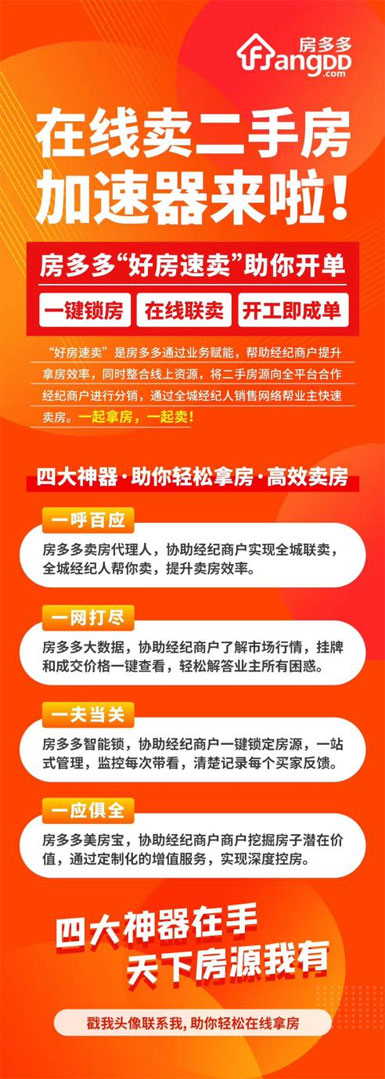 房多多作為國內(nèi)最大的在線房地產(chǎn)交易平臺,抗“疫”期間,除了在第一時間推出“線上售樓處”外,房多多還發(fā)布了面向全行業(yè)免費開放SaaS、免費提供SaaS增值產(chǎn)品“獲客通”等多項賦能舉措。其中,“好房速賣”作為房多多為經(jīng)紀商戶打造的探索疫期賣二手房的升級產(chǎn)品,旨在通過“四大科技賦能”,幫助二手房經(jīng)紀商戶提升拿房效率,整合平臺資源,將房源開放給平臺合作商戶進行分銷,并通過全城經(jīng)紀人聯(lián)賣網(wǎng)絡(luò)進行售賣,以實現(xiàn)快速成交。