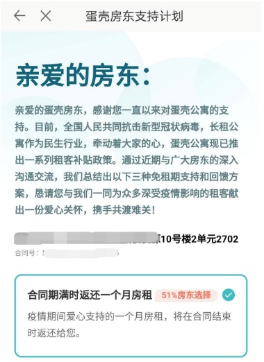 此次推出的“蛋殼房東支持計劃”,不僅對已提供免租支持的房東承諾免租租金返還,同時也本著溝通協(xié)商的原則,為尚未明確表態(tài)的房東提供三種方案,供房東自行選擇決策。此次面向房東的愛心支持與返還計劃,無疑為房東吃了定心丸,也為近日的質(zhì)疑給出有力回應(yīng)。