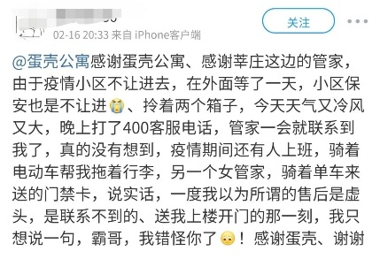 據(jù)了解,疫情期間,曉坤所就職的蛋殼公寓已經(jīng)為數(shù)十萬租客給予了補貼,涵蓋了在租、續(xù)租及新簽租客,是業(yè)內(nèi)首家也是唯一一家面向全體租客給予疫情補貼的公寓企業(yè)。而疫情期間,曉坤的“抗疫”服務(wù)工作,遠不止單單協(xié)助租客進入小區(qū)那么簡單。