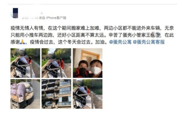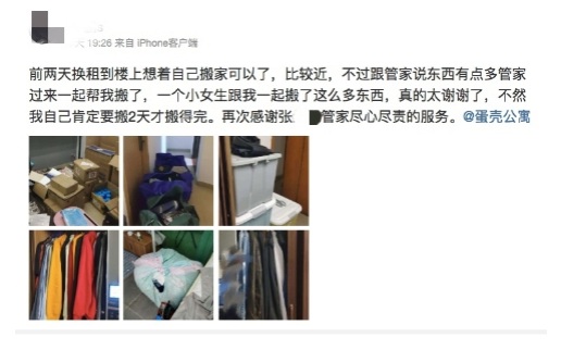 在蛋殼公寓,跟曉坤有一樣想法的人不在少數(shù)。蛋殼公寓的服務(wù)管家小王告訴記者,因為疫情期間,很多搬家公司不能提供上門服務(wù),為了協(xié)助租客安家,他們會想盡辦法克服困難,在沒有更好的交通工具的情況下,很多蛋殼管家都是用自己的電動車,公司運貨的小推車來幫助租客搬運行李,搬一次家有時候要往返兩個小區(qū)之間四五次。