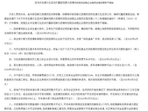 3月12日9時57分,陜西省寶雞市人民政府辦公室印發(fā)《寶雞市住建行業(yè)堅(jiān)決打贏新冠肺炎疫情防控阻擊戰(zhàn)穩(wěn)企業(yè)穩(wěn)民生穩(wěn)發(fā)展若干措施》,措施共計(jì)15條,其中第12條明確,各銀行要積極爭取降低首套住房貸款首付比例政策,公積金貸款最高額度由40萬提高至50萬。