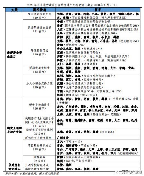 地方密集出臺(tái)房地產(chǎn)支持政策,集中在確保房企資金鏈健康、穩(wěn)定土地和房地產(chǎn)市場(chǎng)、促進(jìn)開(kāi)復(fù)工三大方面