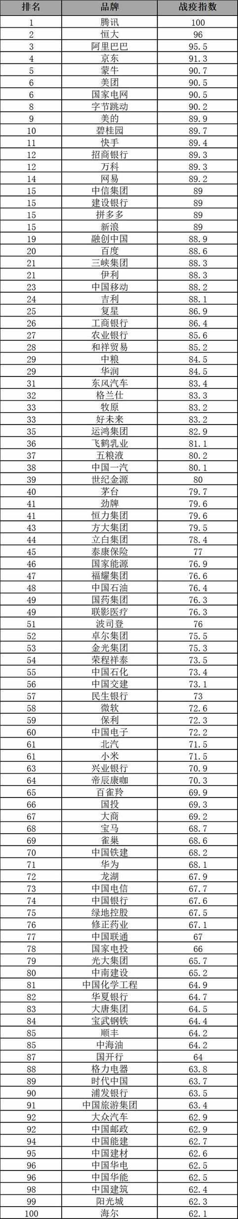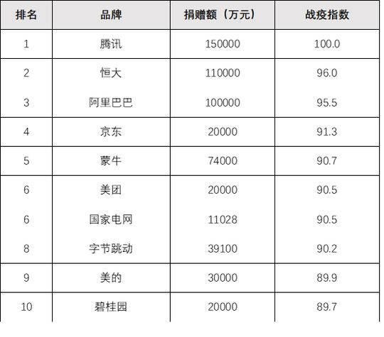 研究報(bào)告顯示,騰訊(100分)、恒大(96分)、阿里巴巴(95.5分)、京東(91.3分)、蒙牛(90.7分)、美團(tuán)(90.5分)、國家電網(wǎng)(90.5分)、字節(jié)跳動(dòng)(90.2分)、美的(89.9分)、碧桂園(89.7分)的品牌戰(zhàn)疫指數(shù)位居前10。其中,騰訊的捐贈(zèng)規(guī)模、捐贈(zèng)速度、傳播聲量均為100分,位列榜首!