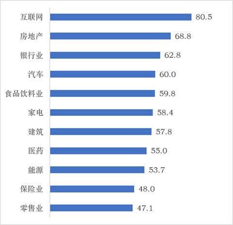 報(bào)告顯示,互聯(lián)網(wǎng)、房地產(chǎn)、銀行、汽車、食品飲料、醫(yī)藥、能源、家電、建筑、保險(xiǎn)、零售等重點(diǎn)行業(yè)中,互聯(lián)網(wǎng)行業(yè)品牌戰(zhàn)疫指數(shù)最高,達(dá)80.5分,其次為房地產(chǎn)行業(yè),達(dá)68.8分,零售業(yè)品牌戰(zhàn)疫指數(shù)最低,僅為47.1分。