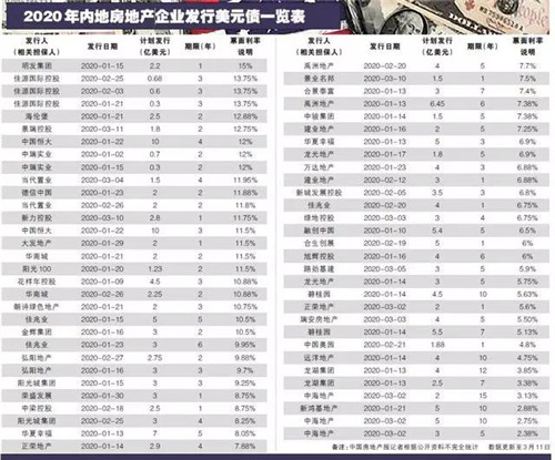 據(jù)記者不完全統(tǒng)計(jì),截至3月11日,2020年內(nèi)地房地產(chǎn)企業(yè)發(fā)行美元債筆數(shù)超過(guò)60筆,合計(jì)發(fā)行規(guī)模約196億美元,包括融創(chuàng)中國(guó)、龍湖集團(tuán)、恒大、碧桂園在內(nèi)的多家房企均公告發(fā)行美元債。其中,單筆發(fā)行規(guī)模最高的是中國(guó)恒大發(fā)行的兩筆10億美元規(guī)模的債券,發(fā)行單筆美元債票面利率最高的是明發(fā)集團(tuán),發(fā)債利率高達(dá)15%。