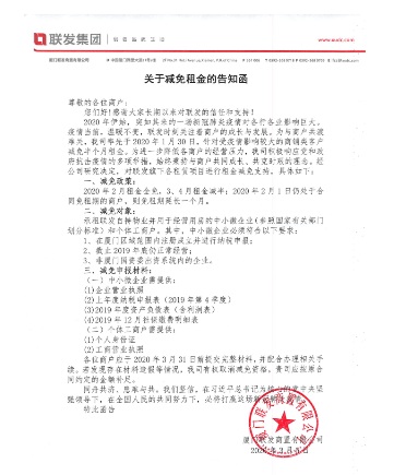 受此次疫情影響,各行各業(yè)都遭受到不小的沖擊,特別是中小微企業(yè)、個體經(jīng)營者、商鋪門店,更面臨著營收下滑、租金費用等經(jīng)營壓力。日前,廈門品牌國企廈門聯(lián)發(fā)商置有限公司積極履行社會責任,發(fā)布了一則減免租金的公告,為園區(qū)商企客戶減免3個月的租金,助力中小微企業(yè)渡過難關。