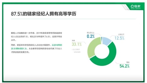 報告顯示,87.5%的鏈家經(jīng)紀(jì)人具有高等學(xué)歷,相比2018年凈增長6.5%,遠(yuǎn)高于同業(yè)水平。同時,統(tǒng)招本科學(xué)歷的經(jīng)紀(jì)人占比也大幅提升,從2018年的20.3%增長到31.3%。