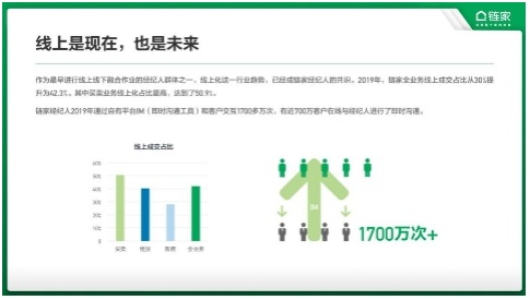 伴隨著產(chǎn)業(yè)互聯(lián)網(wǎng)的發(fā)展,線上化向房產(chǎn)領(lǐng)域的賦能越來越深入。作為最早進行“線上+線下”融合作業(yè)的經(jīng)紀(jì)人群體,鏈家經(jīng)紀(jì)人正在積極擁抱線上化趨勢。報告顯示,2019年,鏈家全業(yè)務(wù)線上成交占比從30%提升至42.3%。其中買賣業(yè)務(wù)線上化占比最高,達到了50.9%。