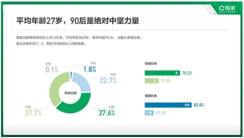 數(shù)據(jù)顯示,目前鏈家有在職經(jīng)紀(jì)人約13萬名,平均年齡為27歲。其中90后是這一群體的中堅力量,占比為75.3%。