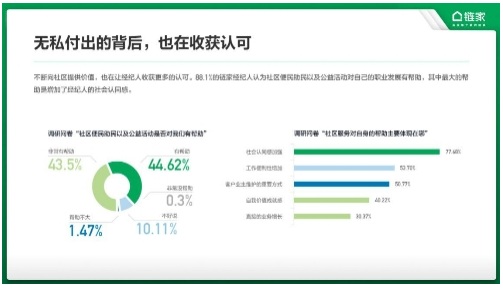 而提供社區(qū)服務(wù)也獲得了大多數(shù)鏈家經(jīng)紀(jì)人的肯定。調(diào)研顯示,88.1%的經(jīng)紀(jì)人認(rèn)為社區(qū)便民助民及公益活動對自己的職業(yè)發(fā)展有幫助,其中最大的幫助是增加了經(jīng)紀(jì)人的社會認(rèn)同感。持續(xù)向社區(qū)提供價值,也在讓經(jīng)紀(jì)人收獲更多的社會認(rèn)可。