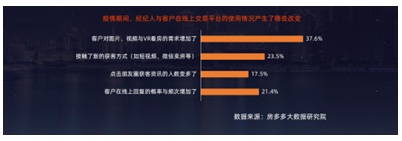 與此同時,37.6%的經(jīng)紀(jì)人感受到疫情期間客戶對圖片、視頻與VR在線看房的需求明顯增加。23.5%的經(jīng)紀(jì)人在疫情期間開始嘗試通過短視頻與微信賣房,17.5%的經(jīng)紀(jì)人明顯感覺與客戶在朋友圈中的互動增多,私域流量對獲客的幫助有所提升。