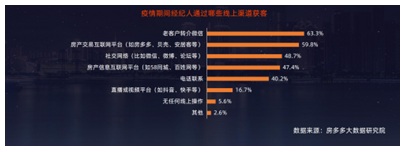 報告數(shù)據(jù)顯示,多數(shù)經(jīng)紀(jì)人在疫情期間通過線上房產(chǎn)交易服務(wù)平臺與社交網(wǎng)絡(luò)渠道獲客;其中63.3%的經(jīng)紀(jì)人 通過老客戶轉(zhuǎn)介微信獲客,59.8%的經(jīng)紀(jì)人通過房產(chǎn)交易互聯(lián)網(wǎng)平臺(如房多多、貝殼、安居客等)獲客。線上房產(chǎn)交易服務(wù)平臺與社交網(wǎng)絡(luò)“組合劍”成為疫情期間獲客利器。