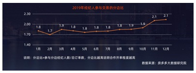此外,跨經(jīng)紀(jì)公司的合作開單漸成趨勢, 83.3%的經(jīng)紀(jì)公司有過聯(lián)賣經(jīng)歷,其中,公司規(guī)模在1至3人的經(jīng)紀(jì)商戶合作意愿高達(dá)93.1%。據(jù)統(tǒng)計2019年12月分邊比為2.1,即成交1個訂單中就有2.1個經(jīng)紀(jì)人參與協(xié)作。