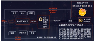 不同渠道的獲客效果也呈現(xiàn)差異化,新房、二手房的獲客渠道集中在房產(chǎn)交易互聯(lián)網(wǎng)平臺(房多多、貝殼等)、 房產(chǎn)信息互聯(lián)網(wǎng)平臺(58、安居客)以及老客戶轉(zhuǎn)介。目前經(jīng)紀(jì)業(yè)務(wù)正從傳統(tǒng)單一的營銷模式,轉(zhuǎn)變?yōu)樾路俊⒍址、租房等多重業(yè)務(wù)聯(lián)動的多元化營銷模式,這也讓經(jīng)紀(jì)人的營銷方式正在從傳統(tǒng)渠道向社交化工具轉(zhuǎn)變。