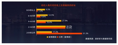 經(jīng)紀(jì)人移動端設(shè)備使用率是PC端的10.9倍,經(jīng)紀(jì)人普遍對移動端無縫跟進(jìn)房源與業(yè)主、及時有效的營銷、高效溝通 客戶等特點(diǎn)表示認(rèn)可,越來越多平臺和用戶認(rèn)識到移動端作業(yè)的重要性和便利性。數(shù)據(jù)顯示,疫情期間經(jīng)紀(jì)人在線時間顯著延長,超六成經(jīng)紀(jì)人在線時長在2~6小時之間.