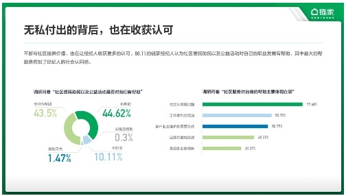 一直以來,鏈家都致力于扎根社區(qū)、服務(wù)社區(qū),充分發(fā)揮門店的資源優(yōu)勢(shì),以多種多樣的便民服務(wù)項(xiàng)目助力居民生活。調(diào)研結(jié)果顯示,提供社區(qū)服務(wù)獲得了大多數(shù)鏈家經(jīng)紀(jì)人的肯定,88.1%的經(jīng)紀(jì)人認(rèn)為社區(qū)便民助民及公益活動(dòng)對(duì)自己的職業(yè)發(fā)展有幫助,其中最大的幫助是增加了經(jīng)紀(jì)人的社會(huì)認(rèn)同感。持續(xù)向社區(qū)提供價(jià)值,也在讓經(jīng)紀(jì)人收獲更多的社會(huì)認(rèn)可。